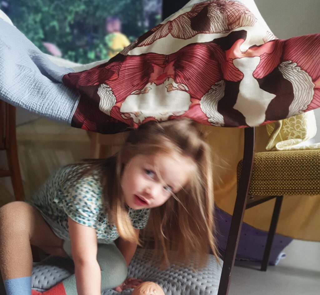 Een doek bestaande uit soms eerder geliefd textiel, vermaakt en gecombineerd naar een grote lap. Drapeer deze doek over een paar stoelen en je hebt een prachtige en unieke tent om uren in te spelen of juist helemaal niks in te doen.