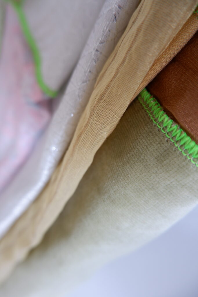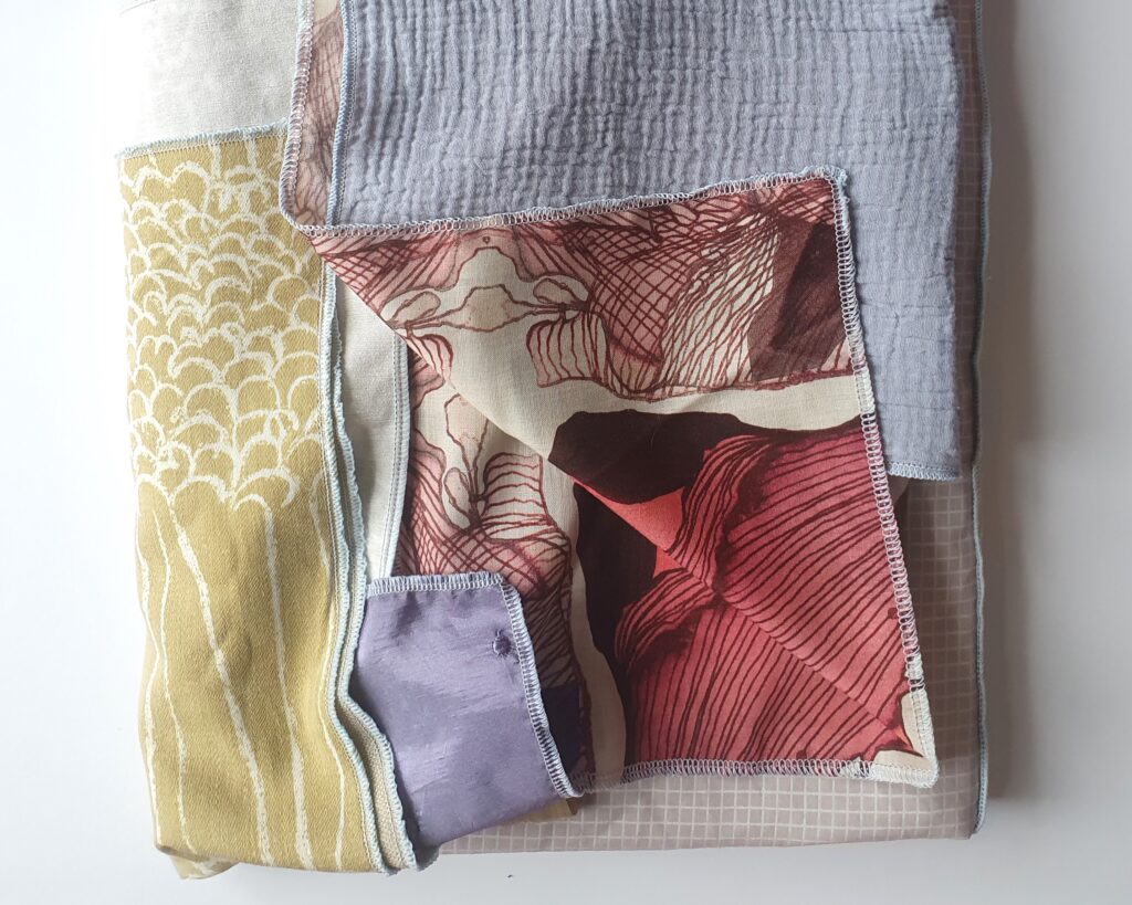 De DagDroomDoek is gemaakt van een mix van stoffen. Lichte en zware stoffen. Neutrale en kleurrijke stoffen. Stoffen met patronen of glans, licht doorlatend of bijna niet. Op die manier is er altijd wat nieuws om naar te turen.